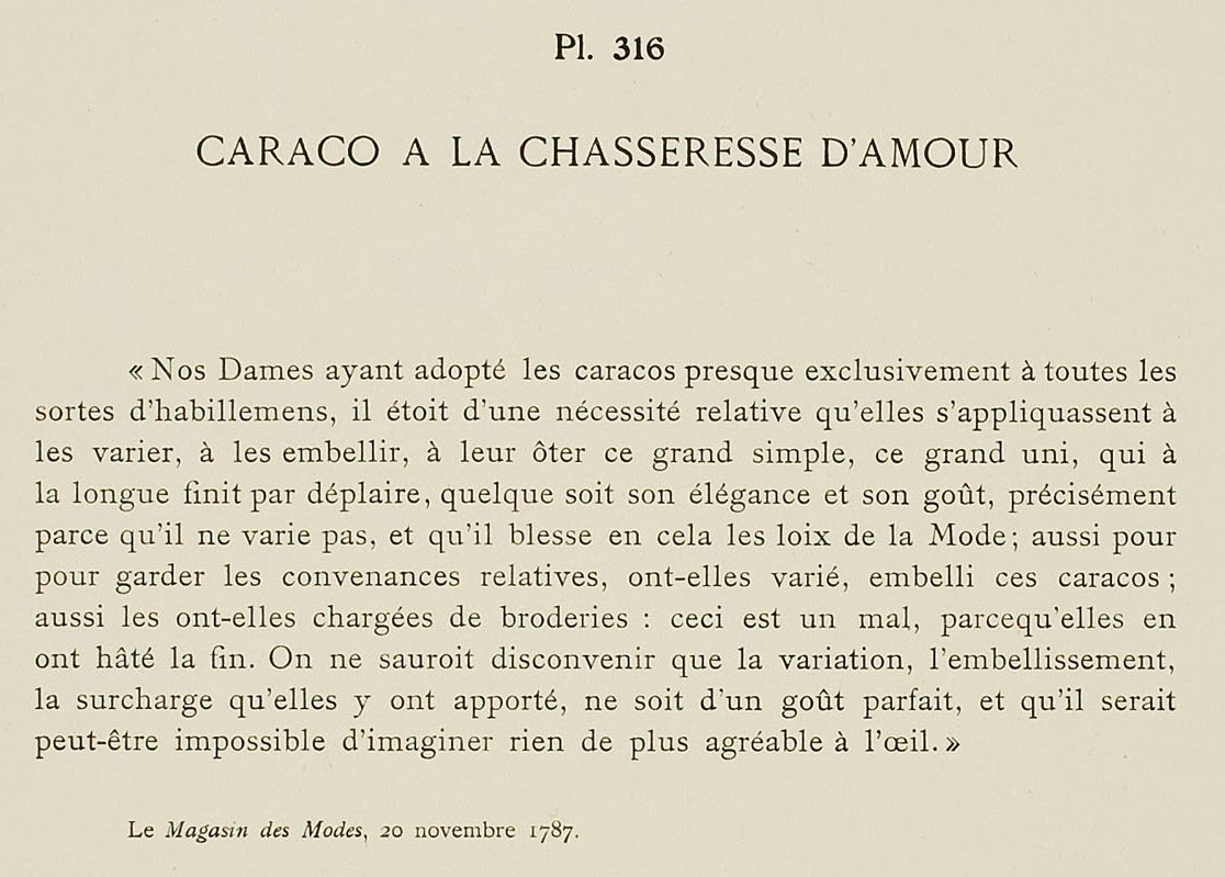 “Our Ladies having adopted caracos almost exclusively for all sorts of dress, it was a relative necessity for them to apply themselves to varying them, to embellishing them, to deprive them of this great simple, this great plain, which in the long run finishes by displeasing, regardless of her elegance and taste, precisely because it does not vary, and because it wounds the laws of Fashion; also in order to guard the relative decencies, have they varied, embellish caracos; also have they laden them with embroidery: this is a bad one, because they have hastened the end of it. One only knows how to disagree with the variation, the embellishment, the overloading that they have brought to them, not be a perfect taste, and that it would be maybe impossible to imagine anything more agreeable to the eye.”