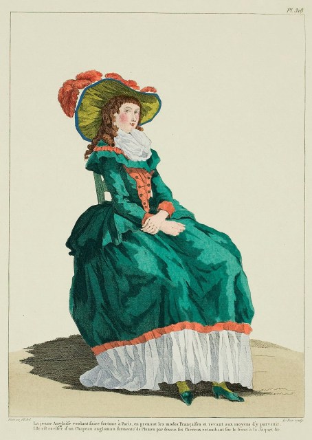 The young Englishwoman wanting to make her fortune in Paris, in taking the French fashions and dreaming of the means of achieving them. She is coiffed in an anglomane Hat surmounted by Plumes over her hair, falling down over the forehead à la Jaquet etc. etc.