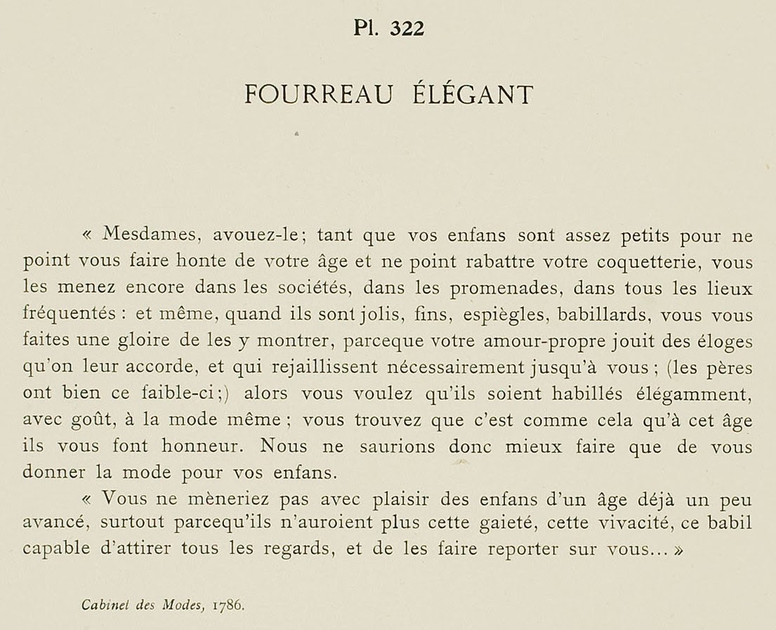 “Mesdames, admit it: while your children are little enough not to make you ashamed of your age and not to shut down your coquetry, you still lead them into society, in the promenades, in all the frequented places and even, when they are pretty, fine, playful, babbling, you make yourself a glory from showing them off, because your pride enjoys the praises which are accorded to them, and which are naturally reflected on you; (the fathers are so weak:) thus you want them to be dressed elegantly, with taste, in the same fashion; you find that it is thus why at this age they give you honor. So we should only do better to give you fashion for your children.