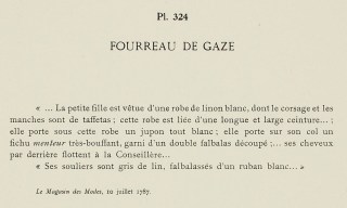 “… The little girl is dressed in a gown of white linen, whose bodice and sleeves are taffeta: this gown is tied with a long and wide belt …; she wears under this gown an all-white petticoat; she wears on her neck a very puffy menteur kerchief, trimmed with a pinked double flounce; …her hair hanging à la Conseillère in back …