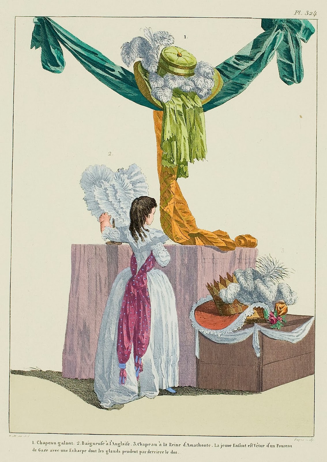 1. Galant hat. 2. Baigneuse à l’Anglaise. 3. Hat à la Reine d’Amathonte.* The young Child is Dressed in a Fourreau of Gauze with a Scarf whose tassels hang behind her back.