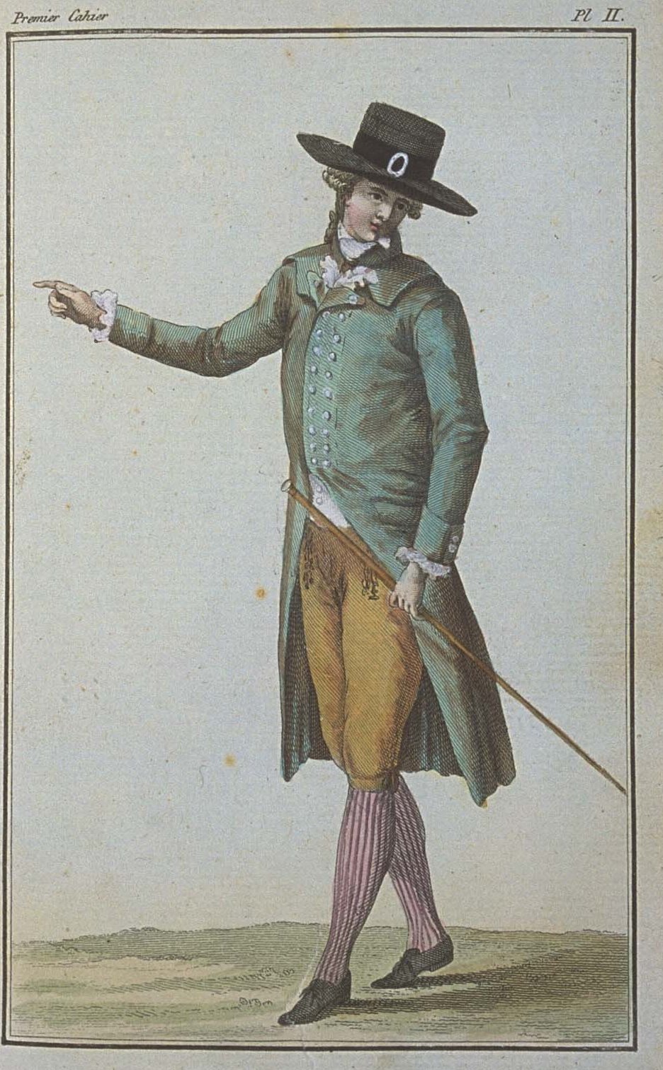 * See Galerie des Modes, 35th book, 3rd figure: “Déshabillé that young people put on in the morning and which consists of a rateen or coutil frock coat, a black or white taffeta cravat, hair in a queue or pulled up with a comb, long breeches known under the name of pantaloons, or artistically worked brodequins.”