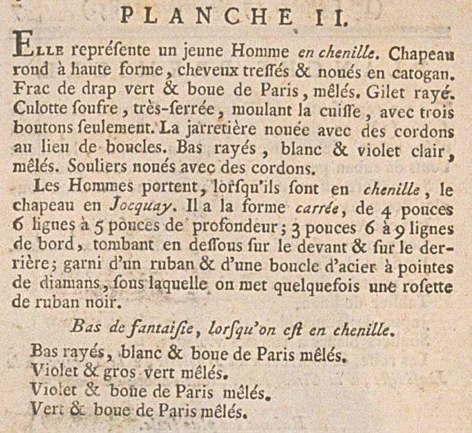 It presents a young Man en chenille.* Round hat with a high crown, hair tressed and tied en cadogan. Frock coat of green and Paris mud wool, mixed. Striped gilet. Sulfur breeches, very tight, molding to the thigh, with only three buttons. The garter tied with cords instead of buckles. Striped stockings, white and light violet, mixed. Shoes tied with cords.
