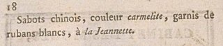 Chinese sabots, carmelite color, trimmed with white ribbons, à la Jeannette.