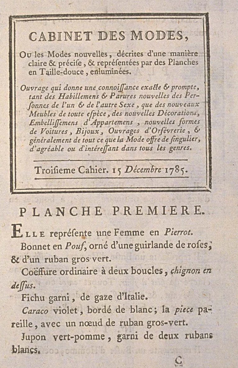 Dear Cassidy,Oh, how interesting!!! The text names the jacket first a Pierrot, and then a caraco. Same garment. Plus, that the fabric underneath the open part of the jacket is a stomacher!!!!!! The pierrot appears to be imitating men's styles with the deep, high cutaway effect.Plus, just like the old stomacher style, I would guess, and pinned in place, but instead of an upward vee, it faces downwards!Omigoodness, is this truly what I am reading? If so, then making such jackets is suddenly much easier. (Although the Internet has lately circulated a yellow dress that imitates the Pierrot effect with trim only: it's really just an anglaise.)Very best,Natalie
