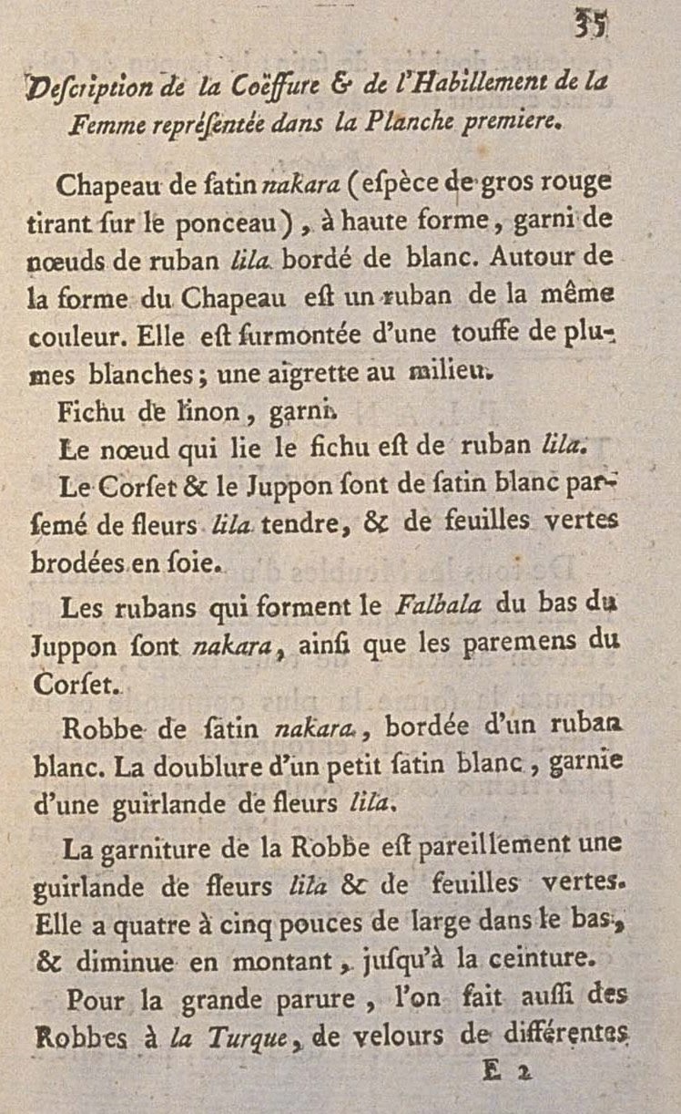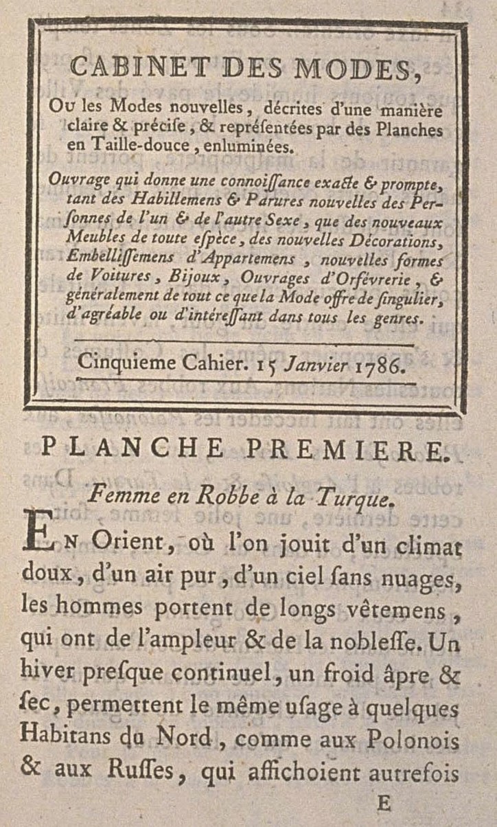 In the Orient, where one enjoys a sweet climate, pure air, a cloudless sky, men wear long garments, which have fullness and nobility. An almost continual winter, a bitter and dry cold, permit the same practice in some Inhabitants of the North, like the Poles and the Russians, who once displayed an oriental luxury. In the temperate Zones to the contrary, where the atmosphere is nearly always humid, the City cobbles covered with mud, the men, to protect them from impropriety, wear short and narrow coats; but women are above the inconveniences of the climate and the intemperacy of the seasons. Frenchwomen, principally in the capital, which is the center of taste, know how to imitate and appropriate even the Costumes of all the Nations. The robes Françaises have been succeeded by the Polonaises, the Polonaises by the Lévites, the Lévites by the robes à l’Anglaise and à la Turque. In this latter fashion a pretty woman, whether in a Show or in the Seats, wins triumphs surer and more agreeable than those of a Georgian or Circassian woman in the Harems of Constantinople. Even the Sultana was jealous of her elegance, her grace, and the homages that were made to her.