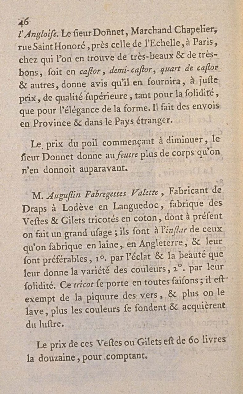 M. Auguffin Fabregettes Valette, Maker of Wools in Lodève in Languedoc, makes Vests and Gilets in tricot cotton, which at present are greatly worn; they are similar to those made in wool, in England, and they are preferable, 1st. for the brilliance and beauty that they give to the variety of colors, 2nd. for their strength. This tricot is worn in all seasons; it is immune to the bite of worms, and the more it is washed, the more the colors are established and acquire luster.