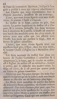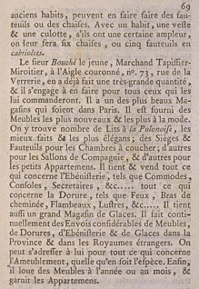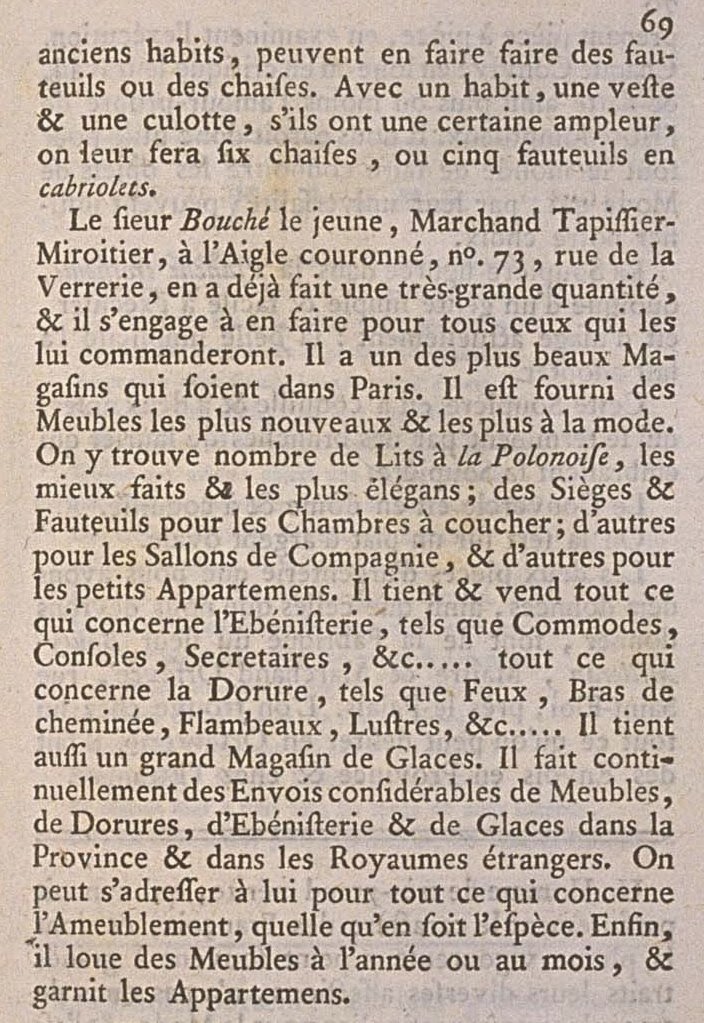M. Bouché the younger, Tapestry Merchant-Mirrorer, at the crowned Eagle, no. 73, rue de la Verrerie, has already made a very great quantity, and he is engaged to make them for all who order them from him. He has one of the most handsome Shops in Paris. He is furnished with the newest and most fashionable Furnitures. One finds a number of Bed à la Polonaise, the best made and the most elegant; Seats and Armchairs for sleeping Chambers; others for Company Salons, and others for little Apartments. He has and sells everything that concerns Cabinetry, such as Commodes, Consoles, Secretaries, etc. … everything that concerns Gilding, such as Lamps, Chimney arms, Candlesticks, Chandeliers, etc. … He also has a large Shop of Mirrors. He continually makes considerable Shipments of Furnitures, Gildings, Cabinetry, and Mirrors in the Provinces and in foreign Kingdoms. One can write to him for everything that concerns Furnishing, which is a type of it. Finally, he leases Furniture by the year or month, and dresses Apartments.