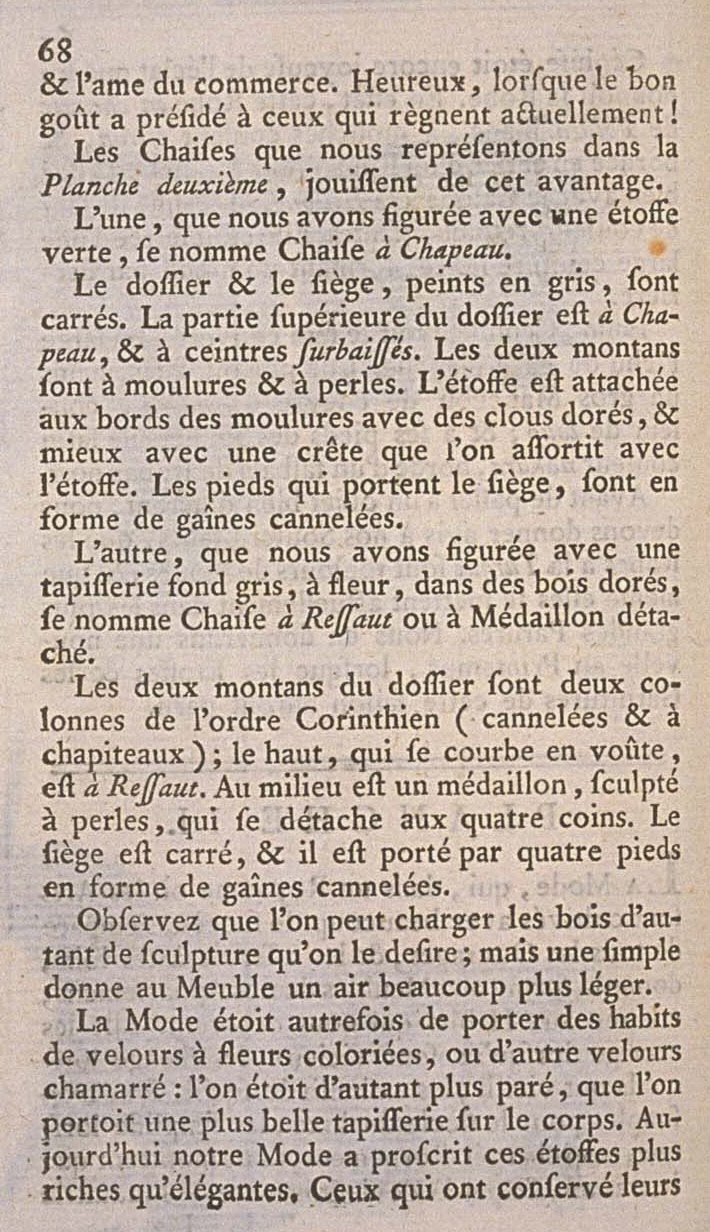 Fashion, which, in a Kingdom where the Arts are cultivated with much success, takes over all Crafts, and enslaves them to its laws, gives shape to the Furniture of our Apartments, as to the Coats that decorate us. It corrects them when they are vicious, changes them when they are old, embellishes them when they are too simple for the age of luxury, simplifies them when, too full of ornaments, they only show the work, and there becomes the mother of industry and the soul of commerce. Happy, when good taste has presided over those who actually reign!