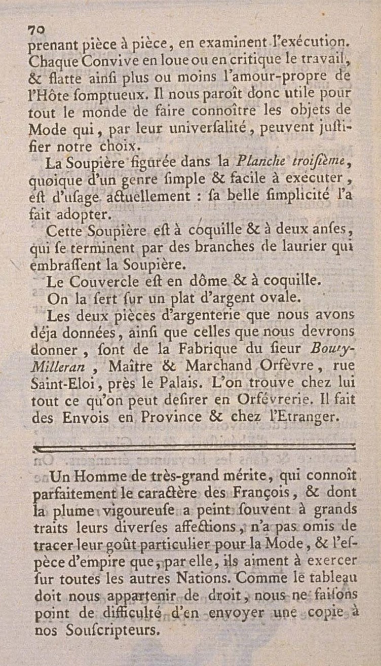 The two pieces of silverwork that we have already given, together with those which we will give, are from the Workshop of M. Boury-Milleran, Master and Merchant Silversmith, rue Saint-Eloi, near the Palace. At his shop is found everything that can be desired in Silversmithy. He makes Deliveries to the Provinces and Foreign countries.