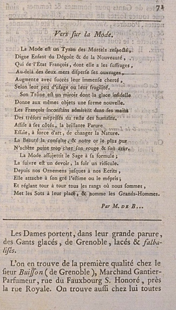 They are found in the first quality in the shop of M. Buisson (of Grenoble), Merchant Glover-Perfumer, rue de Fauxbourg S. Honoré, near the rue Royale. One also finds at his shop all sorts of Gloves for men and women, as well as all sorts of Perfumes, Sultan, Rouge, Almond paste, and generally all that is used in the Toilette: the whole of the first quality, and at a fair price. He makes Deliveries to the Provinces and to Foreign countries.