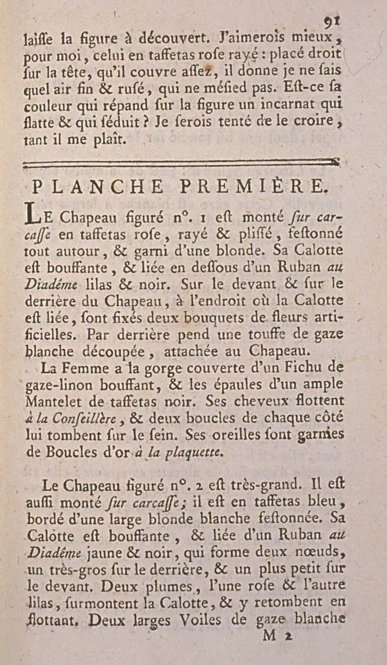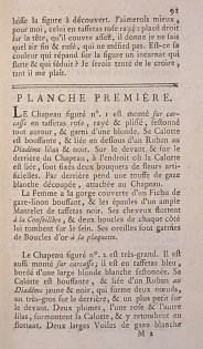 The Hat marked no. 1 is mounted on a frame in pink taffeta, striped and pleated, scalloped all around, and trimmed with blonde lace. Its Crown is puffed, and tied at the bottom with a lilac and black Ribbon au Diadême. On the front and back of the Hat, in the place where the Crown is tied, are fixed two bouquets of artificial flowers. In the back hangs a tuft of pinked white gauze, attached to the Hat.
