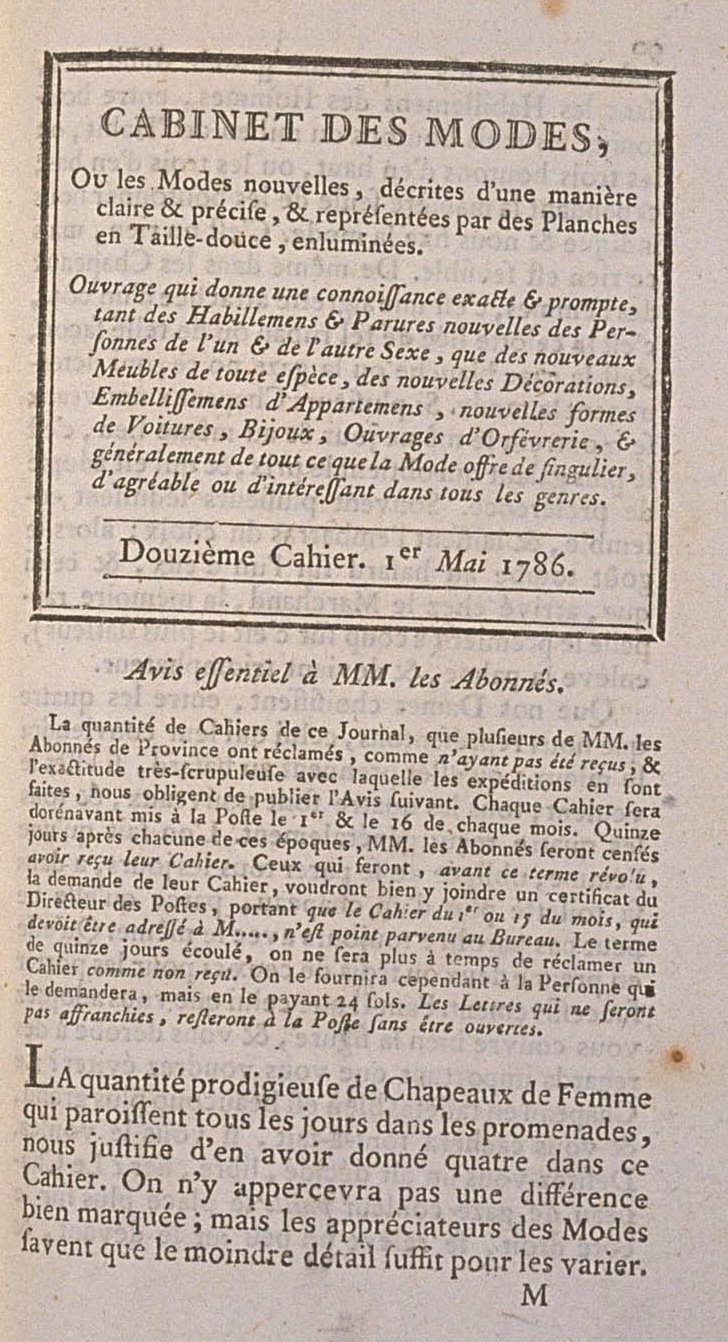 The number of Books in this Journal, that several of Messrs. Subscribers of the Provinces have asked, as not having been received, and the very scrupulous exactitude with which expeditions have been made, oblige us to publish the following Notice. From now on each Book will be taken to the Post on the 1st and 16th of each month. Fifteen days after each of these dates, Messrs. Subscribers will be supposed to have received their Book. Those who, before this term has passed, make a demand for their Book, are requested to send a certificate to the Director of the Post, concerning that the Book of the 1st or 15th of the month, which would be address to M. …, never came to the Office. The term of fifteen days elapsed, there will no longer be time to ask for a Book as not received. It will be furnished, however, to the Person who asks for it, on the payment of 24 sous. Letters which are not franked, will remain in the Post without being opened.