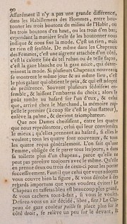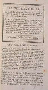 The prodigious quantity of Women’s Hats which appear every day in the promenades, justify us in having given four in this Book. A well marked difference will not be perceived between them; but appreciators of Fashion will know that the least detail suffices to vary them. Assuredly there is not a great difference, in Men’s Dress, between buttoning three buttons in the middle of the Coat, or the top three buttons, or the bottom three buttons; however only the manner of buttoning them is indicated to us and fixes fashion for us. It is nothing, but this nothing is discernible. The same is in Women’s Hats, it is an aigrette attached on one side, it is the crown tied with this ribbon or in that fashion, it is white gauze or black gauze, which determines fashion. If several new Hats show themselves on the same day and in the same place, it is the most