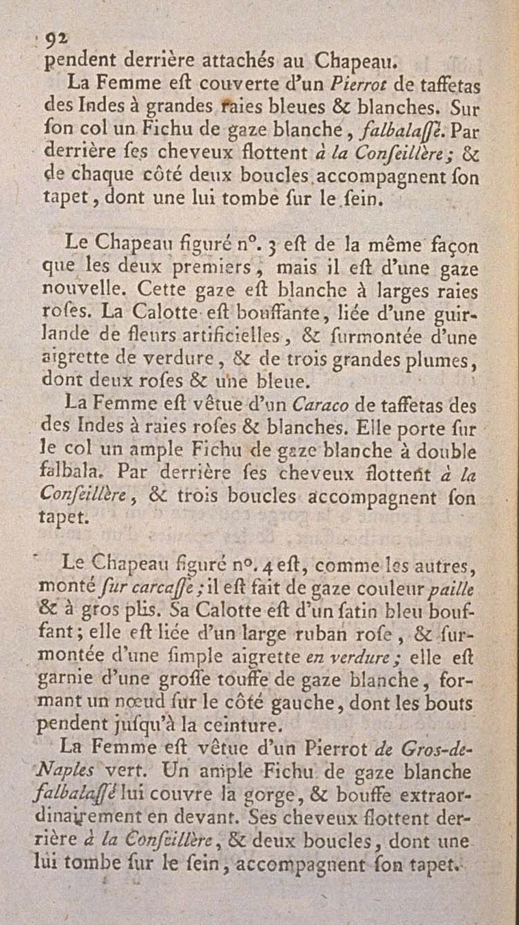 The Woman is dressed in a Caraco of Indian taffeta striped pink and white. She wears on her neck an ample Kerchief of white gauze with a double flounce. In the back her hair hangs à la Conseillère, and three curls accompany her tapet
