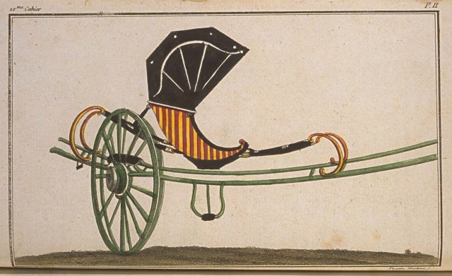 Can there be any lighter and more nimble than the Cabriolet that we have drawn in the 2nd Plate? On a rather long, rather thin, and very narrow Shaft, where a narrow Box is suspended, capable of holding, at most, one person. This Box, made of a very-thin wood, is painted with wide red and yellow stripes. The Dome of a very-glossy black leather, folds by means of four silver springs, and settles in the back on the Box. Two very light Wheels carry the Shaft. The Springs are gilded. The Wheels, Shaft, and Footboard are painted green. The inside of the Box is trimmed with a Louvier wool or another white cloth, and the underside is of a very-glossy black leather.