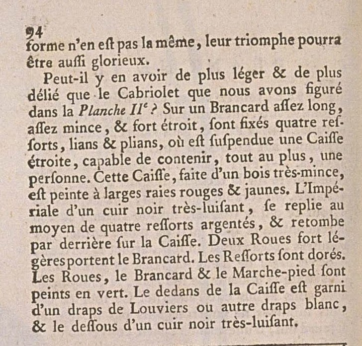 Can there be any lighter and more nimble than the Cabriolet that we have drawn in the 2nd Plate? On a rather long, rather thin, and very narrow Shaft, where a narrow Box is suspended, capable of holding, at most, one person. This Box, made of a very-thin wood, is painted with wide red and yellow stripes. The Dome of a very-glossy black leather, folds by means of four silver springs, and settles in the back on the Box. Two very light Wheels carry the Shaft. The Springs are gilded. The Wheels, Shaft, and Footboard are painted green. The inside of the Box is trimmed with a Louvier wool or another white cloth, and the underside is of a very-glossy black leather.