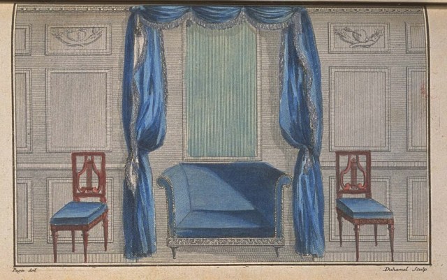 In the most convenient place a rather deep niche is made, at the top of which is attached a drapery of blue Pekin, trimmed with fringe and tassels, and which falls rather low; the outer sides are decorated with draperies, tied at intervals with tassels. Under these draperies are curtains, which are pulled up with tassels.
