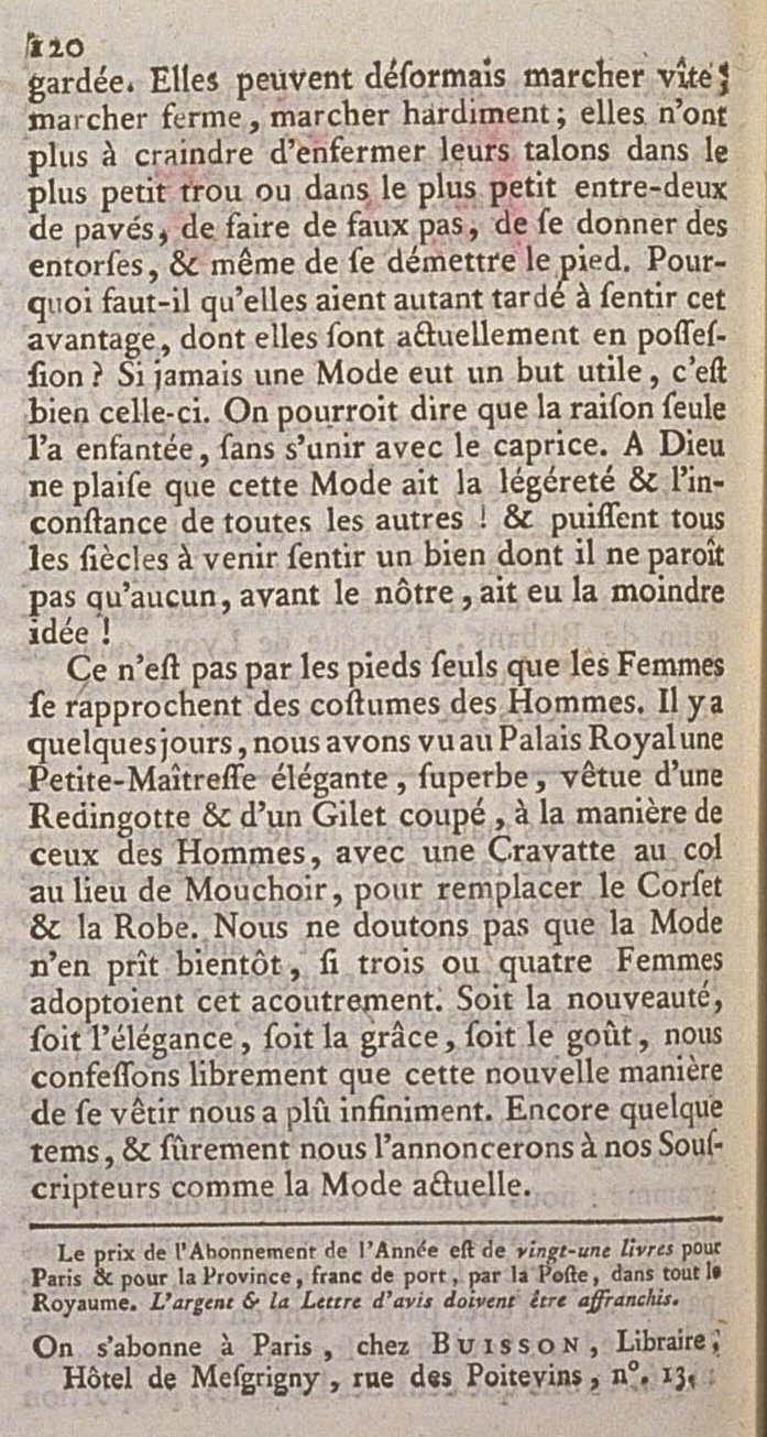 It is not in the feet only that Women approach Men’s dress. For some days, we have seen at the Palais Royal an elegant Petite-Maîtresse, superb, dressed in a Redingote and a different-colored Gilet, like Men’s, with a Cravat at the neck in place of a Handkerchief, to replace the Corset and the Gown. We do not doubt that Fashion would take soon, if three or four Women adopted this dress. Whether for novelty, for elegance, for grace, or for taste, we freely confess that this new manner of dressing pleased us infinitely. Still some time, and surely we will announce it to our Subscribers as the current Fashion.