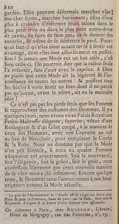 Our Women now care no longer for competing with Men for size, as we believe that they tended to at other times. They concede them this advantage today, so that that one could say they are very indifferent, up to a certain point. They have abandoned these Shoes with raised heels, which raised them nearly two inches. Who wouldn’t think that they acquired a solidity that was lost at other times? We don’t want to make an epigram here: we only want to say that they are no longer exposed to spinning as they had been, carried on weak heels, so narrowed at the bottom, that they seemed to be balancing. The heels of their Shoes are hardly higher, nor narrower than those of Men, proportionally. They can henceforth walk quickly, walk firmly, walk boldly; they no longer fear catching their heels in the smallest hole or in the smallest cracks between paving stones, making a false step, giving themselves sprains, and even twisting a foot. Why must it be that they had to wait so long to feel this advantage, which they are actually in possession of? If ever a Fashion had a useful goal, it must be this one. One could call that the only reason it was born, without joining with caprice. God forbid that this Fashion had the lightness and inconstancy of all the others! and that all the centuries could come to feel a good of which it seems that nobody, before us, had had the least idea!