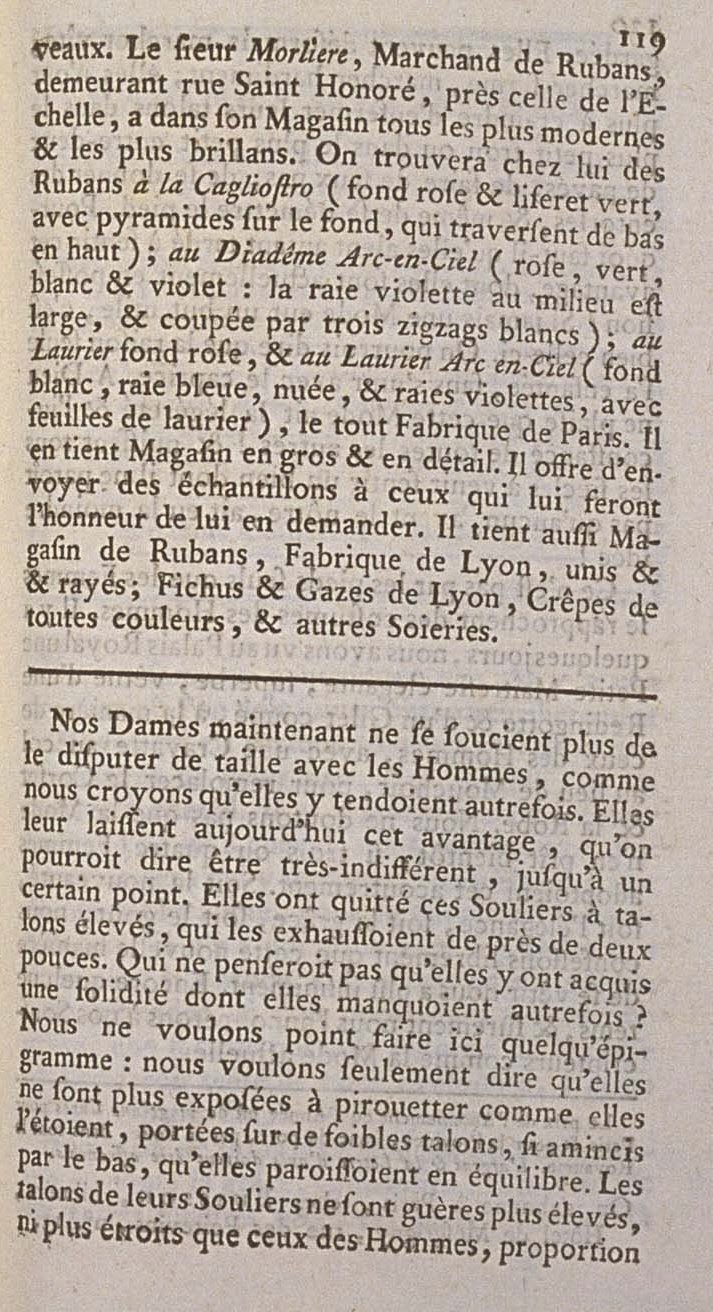 Today Ribbons are subject to such variation, that it is good for Women to have a Furnisher who procures the newest ones for them. M. Morlière, Merchant of Ribbons, residing in the rue St. Honoré, near that of l’Echelle, has in his Shop all the most modern and the most brilliant. One will find in his shop Ribbons à la Cagliostro (pink ground and green edge, with pyramids on the ground, which go from the bottom to the top); au Diadême Arc-en-Ciel (pink, green, white, and purple: the purple stripe in the middle is wide, and cut with three white zig-zags); au Laurier with a pink ground, and Au Laurier Arc-en-Ciel (white ground, blue stripe, clouded, and purple stripes, with laurel leaves), all Made in Paris. He holds a Store of them for wholesale and retail. He offers to send samples to those who will make him the honor of asking him for them. He also has a Store of Ribbons, Made in Lyons, plain and striped; Kerchiefs and Gauzes of Lyons, Crêpes in all colors, and other Silks.