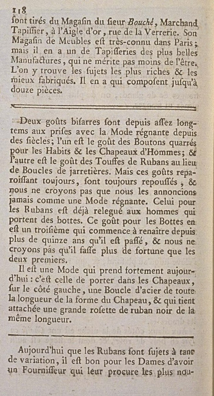 Two bizarre tastes have been struggling with the reigning Fashion for centuries: one is the taste for squared buttons for Men’s Coats and Hats; and the other is the taste for Tufts of Ribbons in place of garter Buckles. But these always reappearing tastes are always repelled, and we do not believe that we should ever announce them as reigning Fashions. That for Ribbons is already relegated to men who wear boots. This taste for Boots is a third one which is beginning to be reborn since the more than fifteen years that it passed, and we do not believe that it will have more luck than the first two.