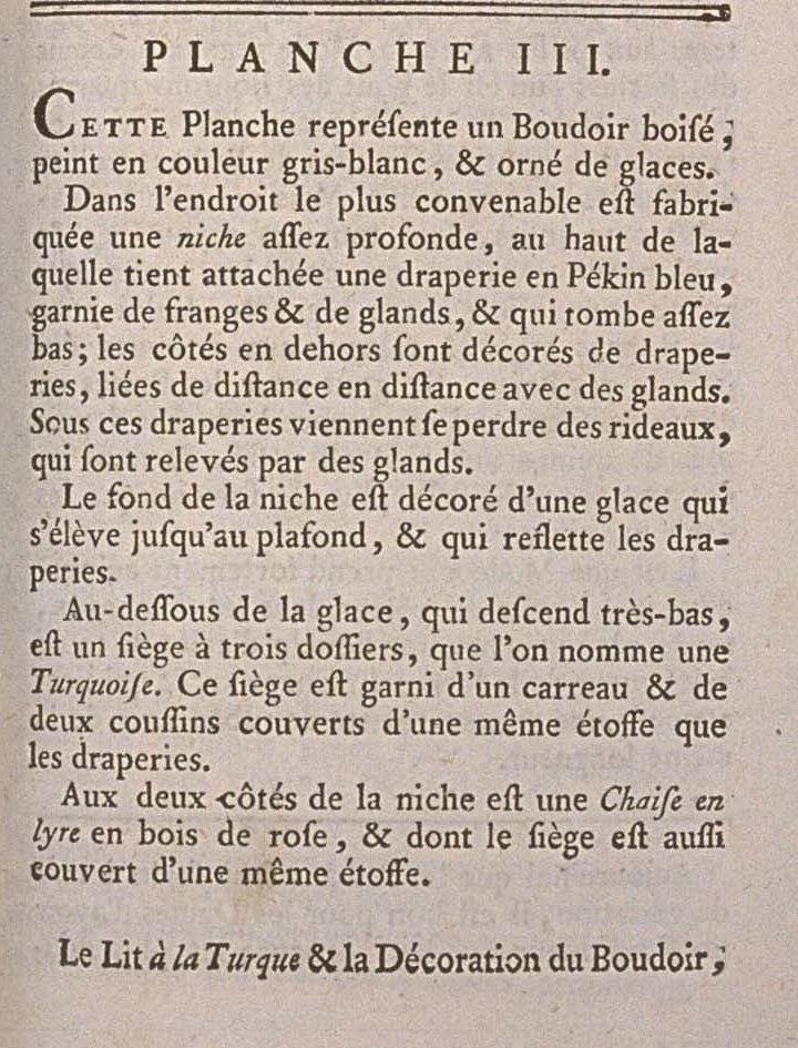 Under the mirror, which descends very low, is a seat with three backrests, that is called a Turquoise. This seat is decorated with a square [cushion?] and two cushions covered with the same fabric as the draperies.