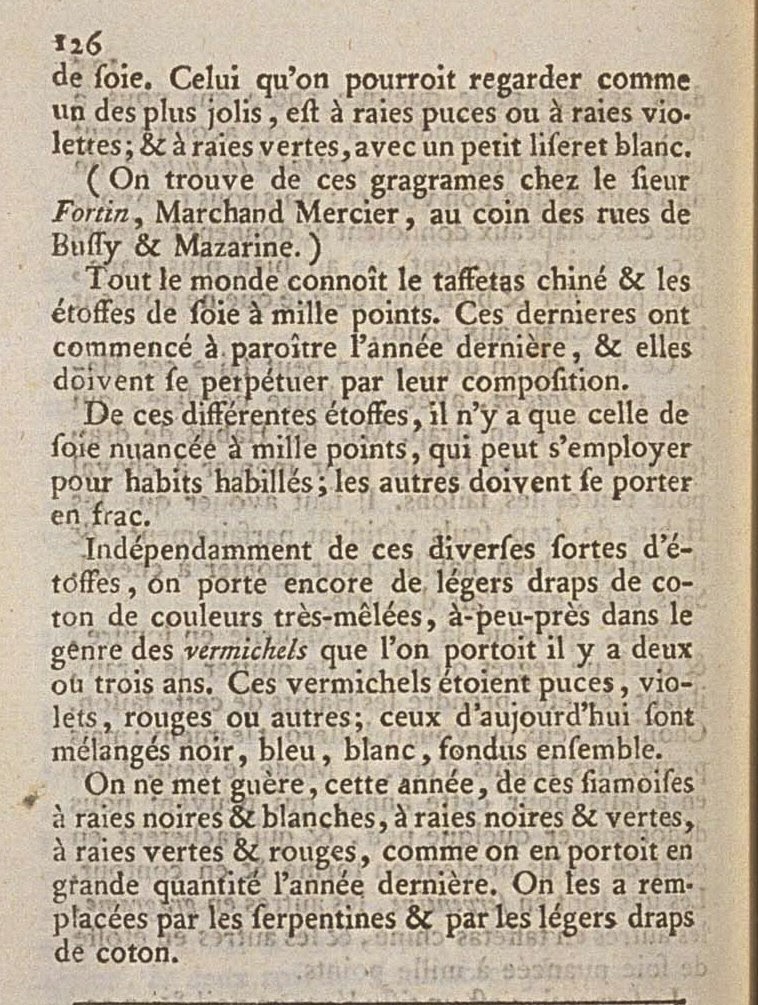 Gragrame, which is either striped or chiné, is a rather firm worked silk fabric and bourre de soie.* What could be seen as one of the prettiest, has puce stripes or violet stripes; and green stripes, with a little white edge.