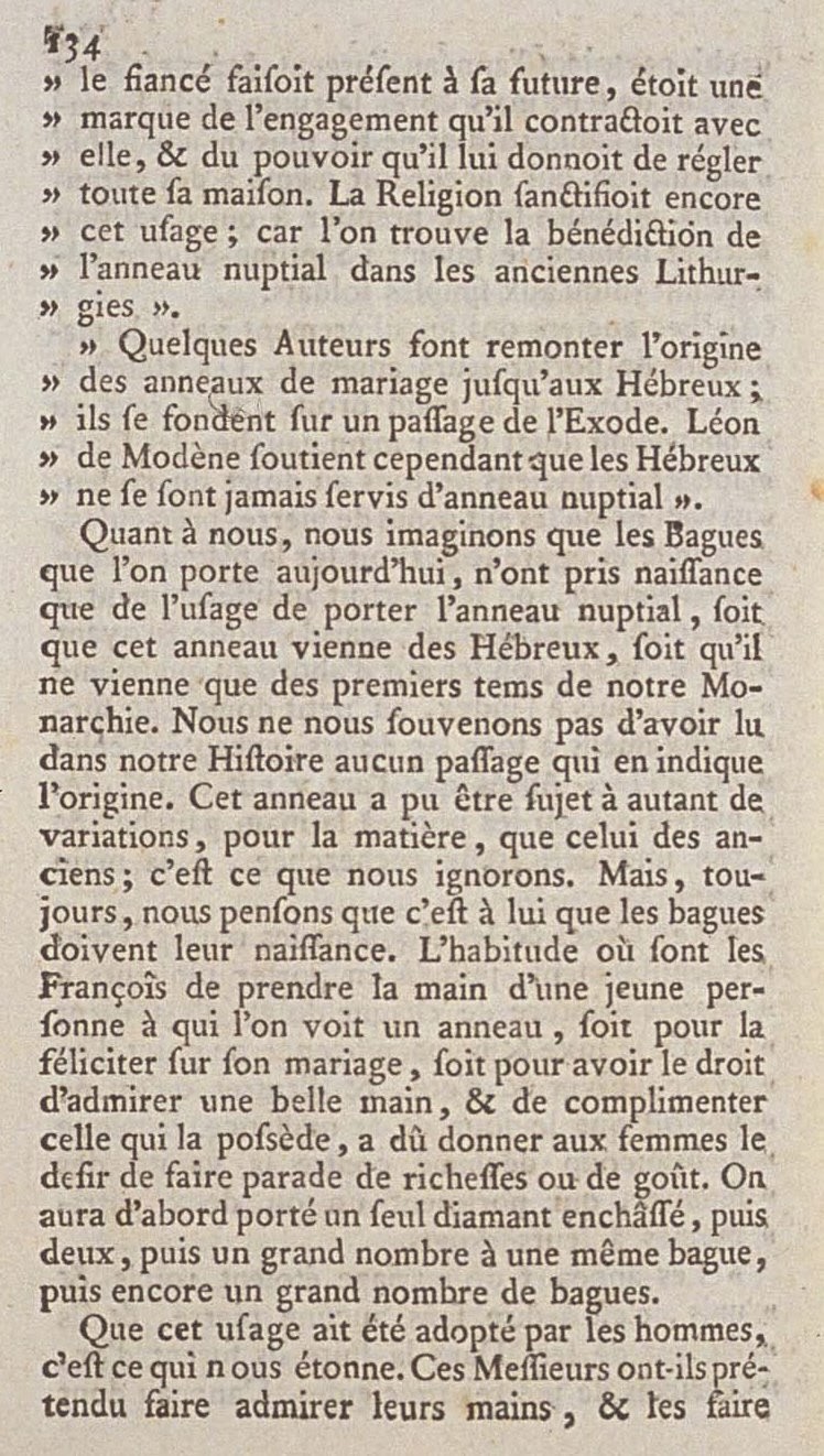 About us, we imagine that the Rings that are worn today, have only given birth to the practice of wearing the nuptial ring, whether this ring came from the Hebrews, or it only came from the earliest times of our Monarchy. We do not remember having read in our History any passage which gives its origin. This ring could be subject to as many variation, in material, as those of the ancients; it is that which we are ignorant of. But, still, we think that it is to that which rings owe their birth. The custom which the French have of taking the hand of a young person on whom a ring is seen, be it for congratulating her on her marriage, be it for the right to admire a beautiful hand, and of complimenting it, must give to women the desire of parading richness or taste. They will have first worn a single enclosed diamond, then two, then a great number of the same ring, then finally a great number of rings.