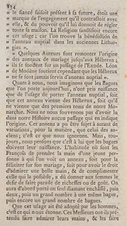 “Marriage rings were round and plain, that is to say without any stone, and they were of iron. In later times they were gold, enriched with precious stones. The ring which the fiancé gave to his intended, was a mark of the engagement that he contracted with her, and of the power that he gave her to rule his household. Religion sanctified further this practice; for the benediction of the nuptial ring is found in the ancient Liturgies.