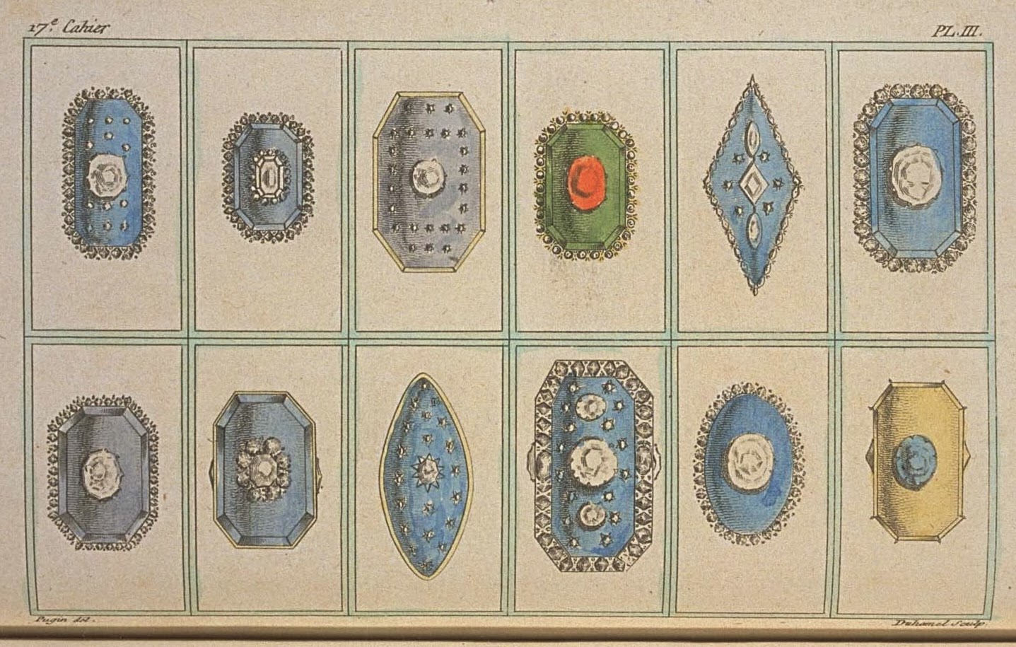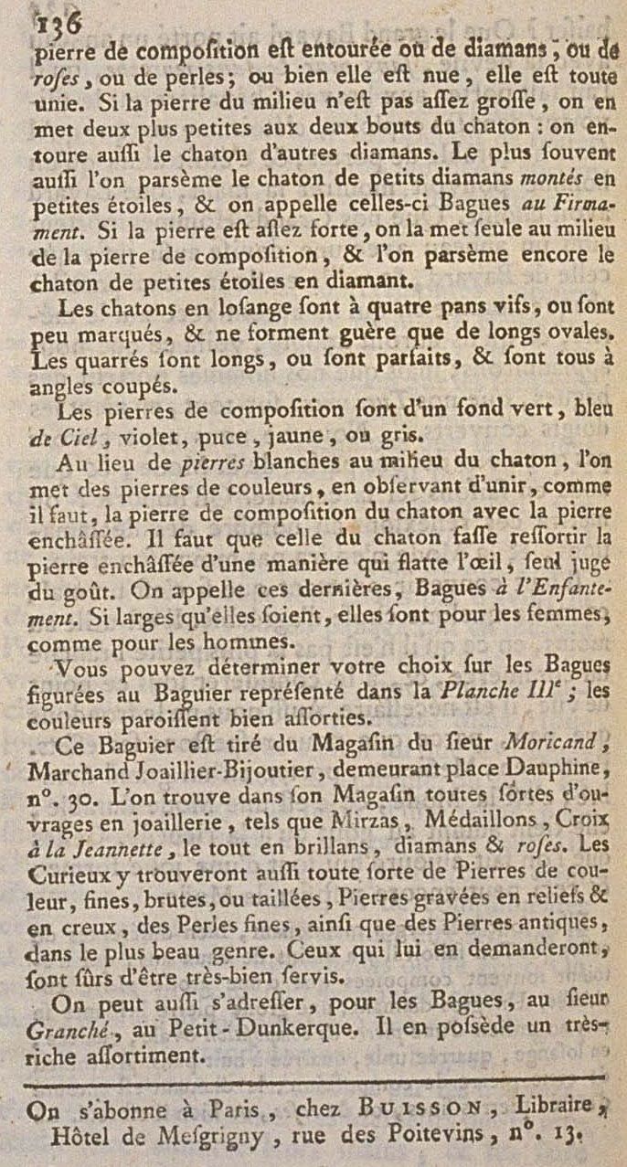 This Ring Chart is drawn from the Shop of M. Moricand, Merchant Jeweler, residing in the place Dauphine, no. 30. All sorts of works in jewelry are found in his Shop, such as Mirzas, Medallions, Crosses à la Jeannette, all in brilliants, diamonds, and roses. The Curious will also find there all sorts of colored Stones, fine, crude, or cut, Stones engraved with reliefs and in hollows, fine Pearls, together with antique Stones, of the best kind. Those who ask it of him, are sure of being very-well served.