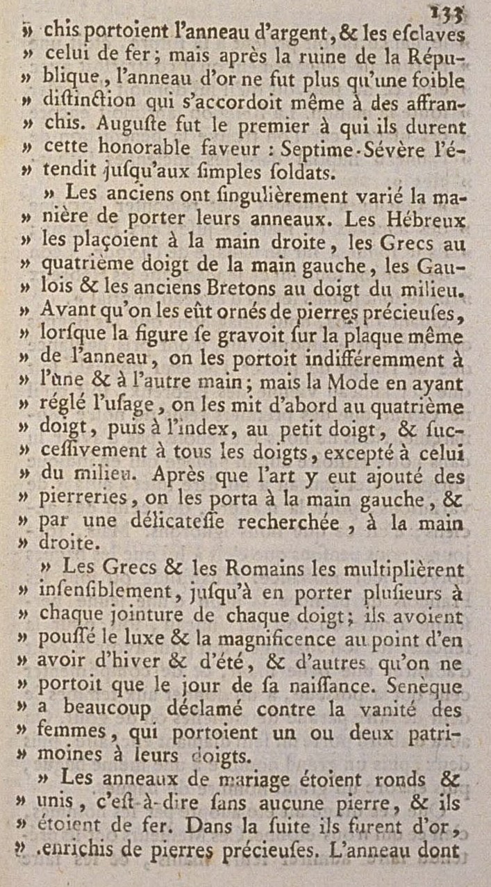 “The Greeks and Romans multiplied them gradually, until they were worn with several on each joint of each finger; they had pushed luxury and magnificence to the point of having winter and summer fashions, and others that were only worn on birthdays. Seneca declaimed much against the vanity of women, who wore one or two inheritances on their fingers.