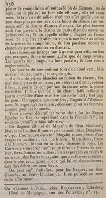 In the place of white stones in the middle of the setting, colored stones are placed, in observing the unity, as there should be, of the composition stone of the setting with the surrounded stone. It is necessary that that of the setting matches the surrounded stone in a manner which flatters the eye, the only judge of taste. These latter ones are called, Rings à l’Enfantement. If they are large, they are for women, as for men.