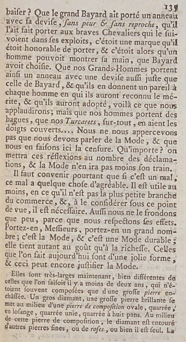 This practice may have been adopted by men, that is what stuns us. Have these Messieurs pretended to admire their hands, and to kiss them? The great Bayard may have worn a ring with the device, without fear and beyond reproach, that he had made for the brave Knights who followed in his exploits to wear, it was a mark that a man could show on his hand, that Bayard had chosen. Our Great Men may thus wear a ring with a device as just as that of Bayard, and give a matching one to each man in whom they have recognized merit, and that they will have adopted, this is what we will applaud; but our men wear rings, our Turcarets, over-all, have their fingers covered by them … We do not perceive that we should speak of Fashion, and that we take censure for it. What matter? these reflections will be put with the number of complaints, and Fashion will not go less in its train.