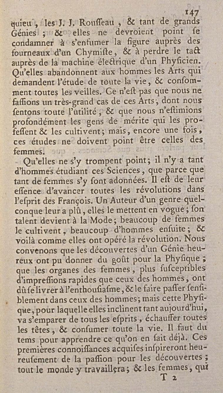 But for men’s occupations, they share them absolutely, they become addicted with the same constancy and the same firmness: one can say that they make the same progress in them. Formerly their sex tried to rival ours, only in works of the mind, because the mind is their element, and they leave us Sciences and Arts. Today Chemistry, Physics, and even Botany are the objects of their studies. Maybe the same motive which drove them formerly, it still drives them today. As there was only a very little circle of Sages, who all focused themselves, and that the rest of the men were writers, women wanted to please the greatest number, overall those who appeared in broad daylight; they studied the Letters, they decorated their minds by reading the Poets, Philosophers, Novelists; and the great Authors who lived them, were well made to turn their heads. Now that everyone seeks to be wise, alas! the reign of Letters is passed! Now that all men are Chemists, Botanists, or Physicists, it is very necessary that women be of the same era, and that they acquire all these talents. It is however an Art pushed today to the highest degree, which must prolong the reign of Poetry, from which it is inseparable, and to preserve in our Ladies the taste for the Arts of pure pleasure, for which they are born. Gluck, Piccini, Gossec, Sacchini, Gretri, and such other skillful Artists, should well replace Corneille, Racine, Voltaire, Montesquieu, J. J. Rousseau, and such other great Geniuses with them; and they would never order them to smoke their faces in the furnaces of a Chemist, and to lose their sensitivity in a Physicist’s electric machine. They may abandon to men the Arts which demand study for the whole life, and consume old age. It is not that we would make a very-great case for these Arts, of which we feel all the usefulness, and that we would not profoundly esteem the people of merit who profess and cultivate them; but, once again, these studies should never be those of women.