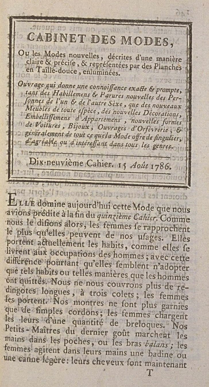 See here the sketch of the evils that we have feared for Ladies, the spirit of imitation which seized their souls. Though it may be, after having said how they imitate us in our occupations, let us show where they imitate us in our coats.