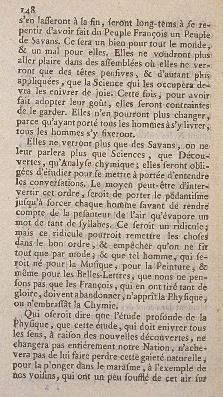 They should not be mistaken; there are so many men studying these Sciences, because so many women are engaged in it. It is in their nature to advance all the revolutions in the French mind. An Author of an ordinary type pleased them, they made him in vogue; his talent became Fashionable; many women cultivated him, make men followed; and thus they worked the revolution. We agree that the discoveries of a happy Genius have been able to give a taste for Physics; that the organs of women, more susceptible to rapid impressions than those of men, have been able to give way to enthusiasm, and pass it sensibly to those of men; but this Physics, for which they are so inclined today, will seize all minds, heat all heads, and consume one’s whole life. It is necessary at times to learn what is already known of it. These first acquired understandings will happily inspire passion for discoveries; everyone will find that; and the women, who will leave it at last, will for a long time repent of having made the French People a Wise People. It will be a good thing for everyone, and a bad thing for themselves. They will no longer want to please in the assemblies where they only see pensive heads, and even more applied, that the Science which occupies them will make them drunk on joy. This time, in order to have made their taste be adopted, they will be constrained to keep it. They will no longer be able to change it, because having focused all men on being engaged with it, all men will be fixed on it.