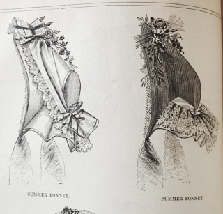 The last time I made a bonnet, I used a pattern from a book, scaled it up to fit my head, and adjusted it to have the flare I wanted. I was proud of it at first, but later realized that it leaned to one side and was kind of awkward. And that was for a fairly standard shape! The 1850s-60s spoon bonnet shape is very odd to me, and I was prepared to buy an actual buckram or straw frame … but then I looked into them, and oof. A bit steep, especially since I’m going to buy a pre-made hoop to cut down on stress and post-event “I look so awkward” blues. So I shopped around and ended up buying a pattern for it (along with three others – a high-crowned Regency bonnet, an 1870s-80s hat, and one of those odd tiny 1890s bonnets that sit on your bun) from Lynn McMasters, at a price – $10 each – that seems to be very fair for the market. I’m going to make sure not to leave this until last, and so I’m looking at bonnet styles at the same time as dress trimmings.