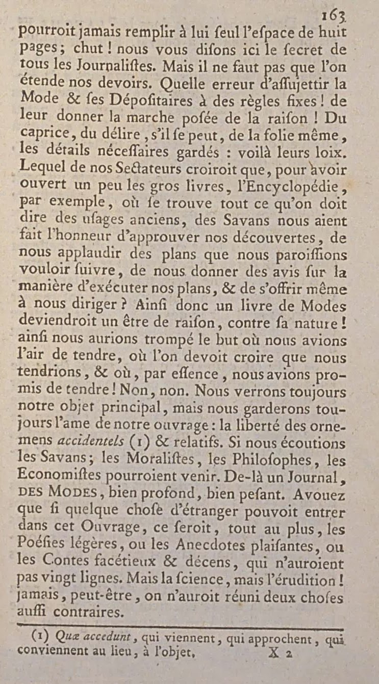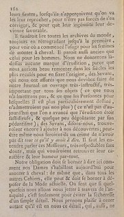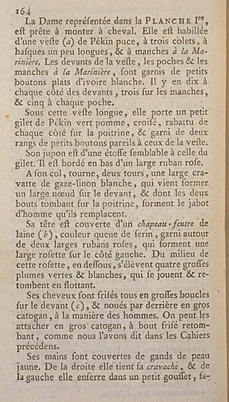 Our obligation must be limited to saying here how our Ladies dress today for riding: the same as, in all the other Issues, it can and must be limited to setting down the current Fashion. One feels that if sometime we are going to throw ourselves across antiquity, it is only to avoid the barrenness of a simple detail. We take pleasure in decorating as far as it is in us this detail, which, also, could never fill only the space of eight pages; hush! we tell you here the secret of all Journalists. But it is not necessary that one extends our duties. What an error to subject Fashion and her Trustees to fixed rules! to give them progress positioned on reason! On caprice, on delirium, if possible, on the same folly, the necessary details guarded.: there are their laws. Which of our Votaries believed that, for having opened large books a little, the Encyclopedia, for example, where is found everything that one must say of the old customs, the Scholars have done us the honor of approving our discoveries, of applauding us for plans that we would seem to want to follow, of giving us advice on the manner of executing our plans, and of offering even to direct us? And therefore a book of Fashions would become a thing of reason, against its nature! therefore we would have tricked the purpose which we would have the air of tendering, which one should believe that we should tender, and which, in essence, we should have promised to tender! No, no. We will always see our principal object, but we will always guard the soul of our work: the liberty of accidentel (1) and relative ornaments. If we should listen to Scholars; Moralists, Philosophers, Economists could come. And there is a Journal, ON FASHIONS, very profound, very heavy. Admit that if something foreign could enter this Work, it would be, at most, light Poetry, or pleasant Anecdotes, or facetious and decent Stories, which wouldn’t be twenty lines long. But science, but erudition! never, perhaps, would one bring together two so contrary things.