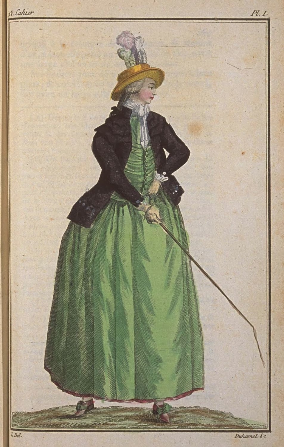 WE represented in the sixteenth Issue a man ready to ride a horse; we would have perhaps had to represent immediately, in the seventeenth, a Lady equally ready to ride; and in coming back today what we gave in this seventeenth, we see that we would have the same, because it was never as important to paint the two women in robes à la Turque, very different, it is true, in taste, but similar in form, that to bring order to our Issues. It is a fault, we confess, and maybe it will not be the last that we commit. Our good faith makes us pardon it. But what is good with us, is that when we feel our wrongs, we rush to repair them. One doesn’t believe that we resemble these people who hasten to confess in advance their faults, when they perceive that they are going to be reproached, in order not to be forced to correct them, and in order that their ingenuity becomes them favorably.