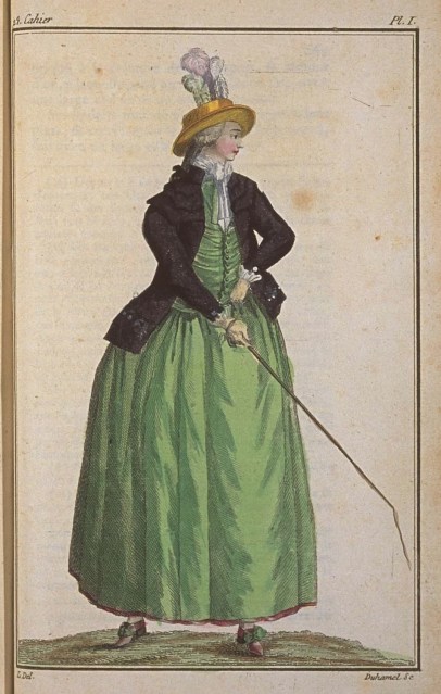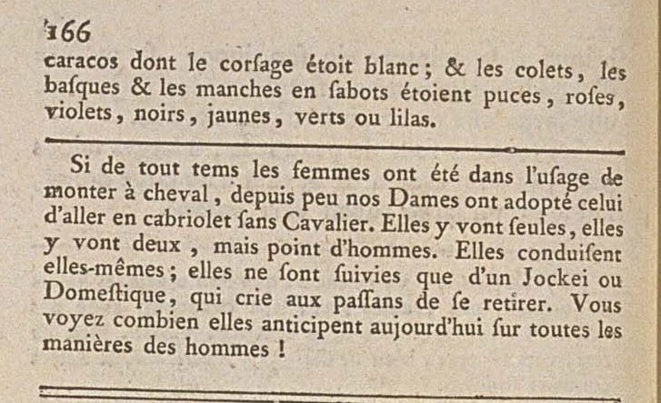If at all times women had been in the habit of riding, recently our Ladies have adopted that of going in a cabriolet without an Outrider. They go alone, they in pairs, but not with men. They drive themselves; they are only followed by a Jockey or Manservant, who cries to the passersby to move back. You see how much they anticipate all men’s manners today!