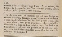 It would be necessary to read all the archives of the world, always going back to the first, to see where the practice of women riding horses began. It seems as ancient as men doing it. We will not give below any mark of erudition, because we would have to go back to the most remote eras to fix its origin, some Scholars, who have assured us that we should make our Journal a very-instructive work, very-important on all its subjects (what we do not admit, and what the People for which it is most particularly define, did not admit either) (it is not today that it has been advanced that erudition was fastidious, and a little bit distasteful in its pedantry); some Scholars, said we, found to add still to their discoveries; perhaps they would even make us a crime of not having said everything that there was to say. It is necessary to listen to these Messieurs speak, who are very-respectable without a doubt, but who wanted to find again their character and their humor everywhere.