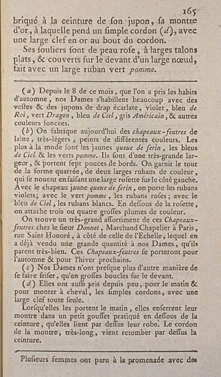 A very-great assortment of Felt-hats are found in the shop of M. Donnet, Merchant Hatmaker of Paris, rue Saint Honoré, next to that of l’Echelle, which has already sold a great quantity to our ladies, that seem very-well. These Felt-hats are worn in the autumn and next winter.