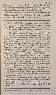 On her neck, wrapped, twice, a wide cravat of white linen-gauze, which comes to form a large bow on the front, and whose two ends falling on the chest, form the man’s jabot that they replace.