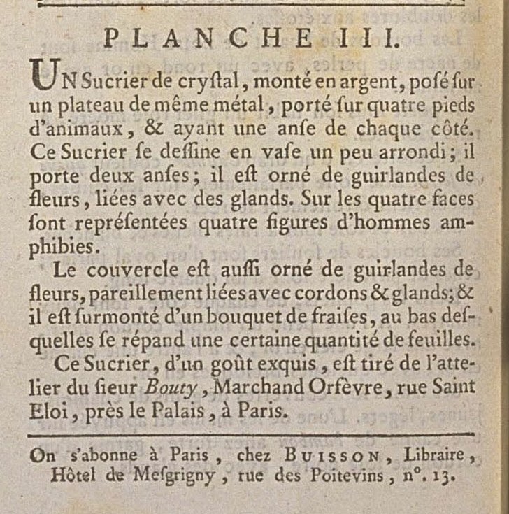 This Sugar bowl, of an exquisite taste, is drawn from the workshop of M. Bouty, Merchant Silversmith, rue Saint Eloi, near the Palace, in Paris.