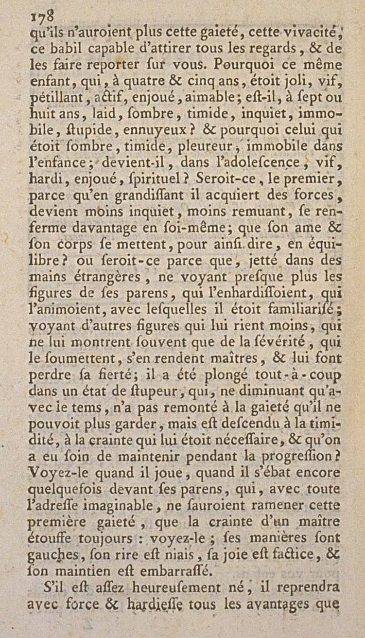 You would not lead with pleasure children of an age already a little advanced, mainly because they would not longer have this gaiety, this vivacity, this babble capable of attracting all eyes, and of bringing them back to you. Why is this same child, who at four and five years was pretty, bright, bubbly, active, playful, friendly, at seven or eight years ugly, somber, timid, worried, motionless, stupid, boring? and why does this one who was somber, timid, weepy, immobile in childhood become, in adolescence, bright, bold, playful, witty? Would it be, the first, because in growing he acquires these forces, becomes less worried, less restless, more self-contained; that his soul and his body are put, so to speak, in equilibrium? or would it be because, thrown into the hands of strangers, hardly seeing the faces of his parents who emboldened him, who animated him, with which he was familiar; seeing other faces who laugh less at him, who often only show him severity, who submit to him, make themselves masters, and are lost to their pride; he is plunged all at once into a state of stupor, which, only diminishing with time, has not recovered the gaiety that he could no longer guard, but descended into timidity, to the fear which was necessary to him, and was care taken to maintain him during this progression? See when he plays, when he romps again sometimes in front of his parents, who, with all imaginable address, would not know how to bring back this first gaiety, but the fear of a master still stifles him: see him; his manners are gauche, his laugh is inane, his joy is artificial, and his composure is embarrassed.