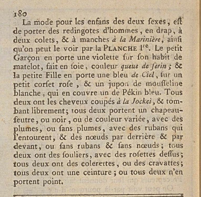 The fashion for children of both sexes is to wear men’s redingotes, in wool, with two collars, and with sleeves à la Marinière, as can be seen in the Ist PLATE. The little Boy wears a violet one over the coat of his matelot, made of silk, canary’s tail color; and the little Girl wears one of Sky blue, over a little pink corset, and a white muslin petticoat, which covers one of blue Pekin. Both have hair cut à la Jockei, which falls freely; both wear a felt hat, either black or a varied color, with plumes, or without plumes, with ribbons wrapping it, and bows in the back and front, or without ribbons and bows; both have shoes with bows on top; both have colerettes, or cravats; both have a belt; or both do not wear them.
