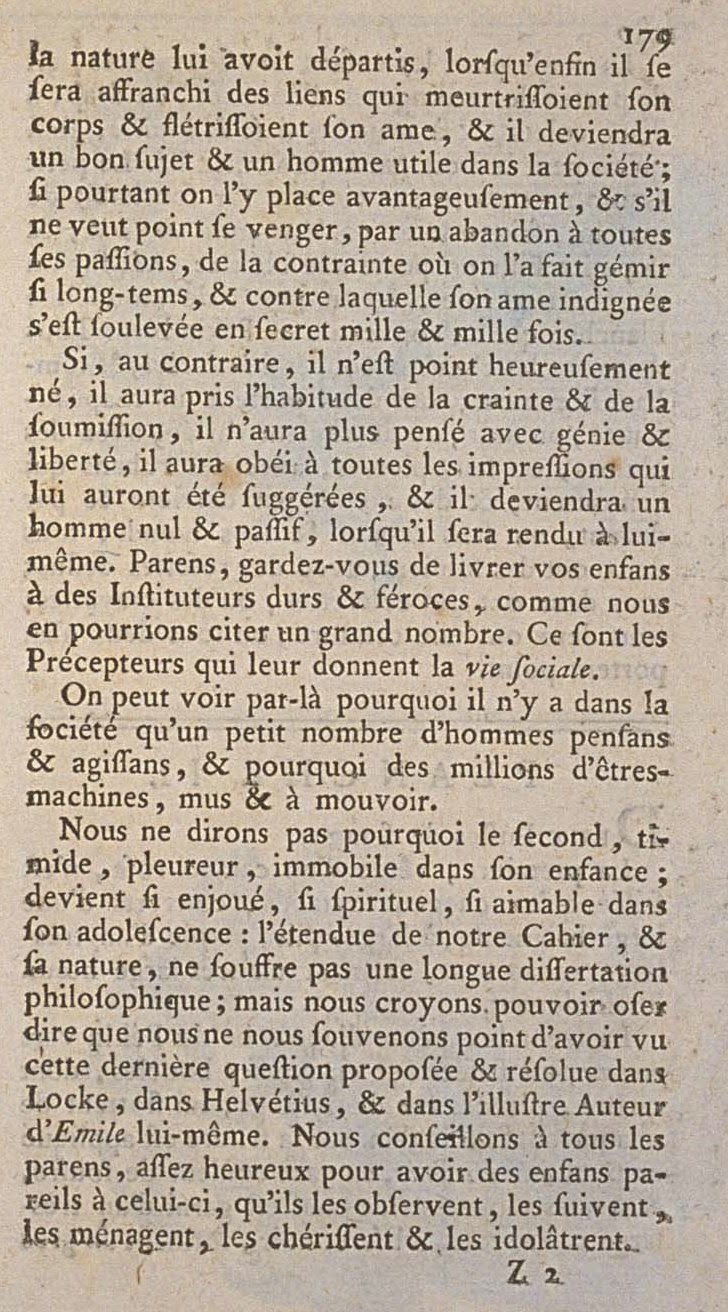 If, on the contrary, he is not fortunately born, he will have made a habit of fear and submission, he would no longer have thought with genius and liberty, he will have obeyed all the impressions which will have been suggested to him, and he will become a null and passive man, when he is rendered to himself. Parents, make sure to free your children from the hard and fierce schoolmasters, such as we would be able to cite a large number of. They are the Preceptors who give them the social life.