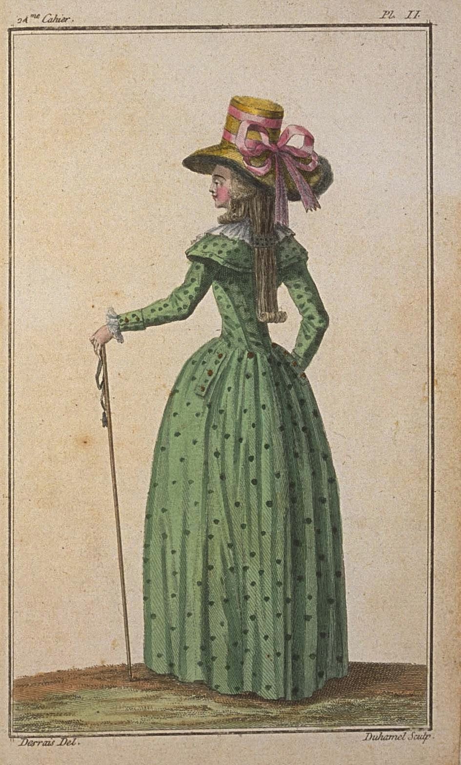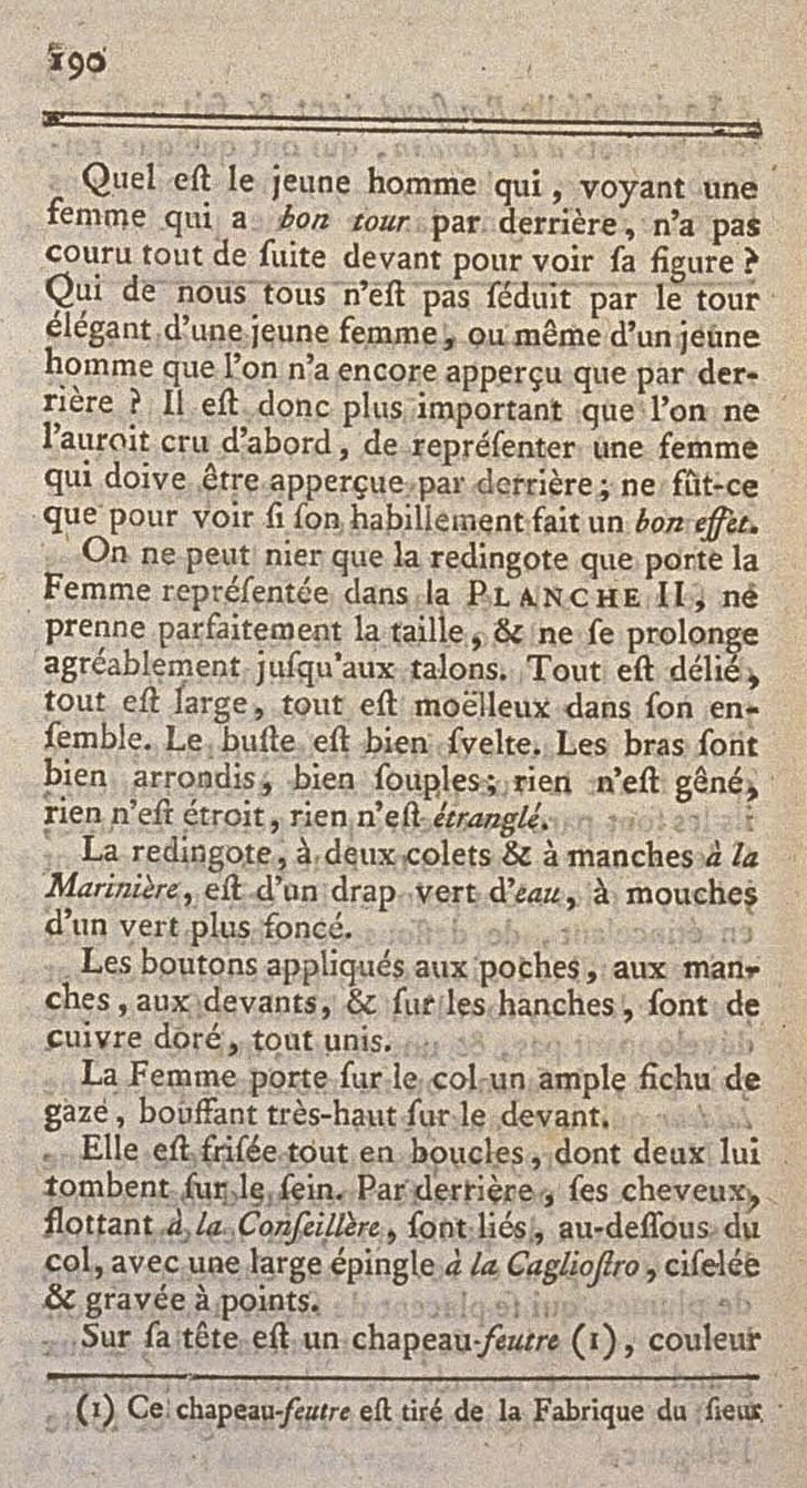 One cannot deny that the redingote that the Woman represented in PLATE II wears perfectly fits her shape, and hangs agreeably to her heels. All is fine, all is wide, all is smooth as a whole. The bust is very svelte. The arms are well rounded, very supple; nothing is constrained, nothing is narrow, nothing is strangled.