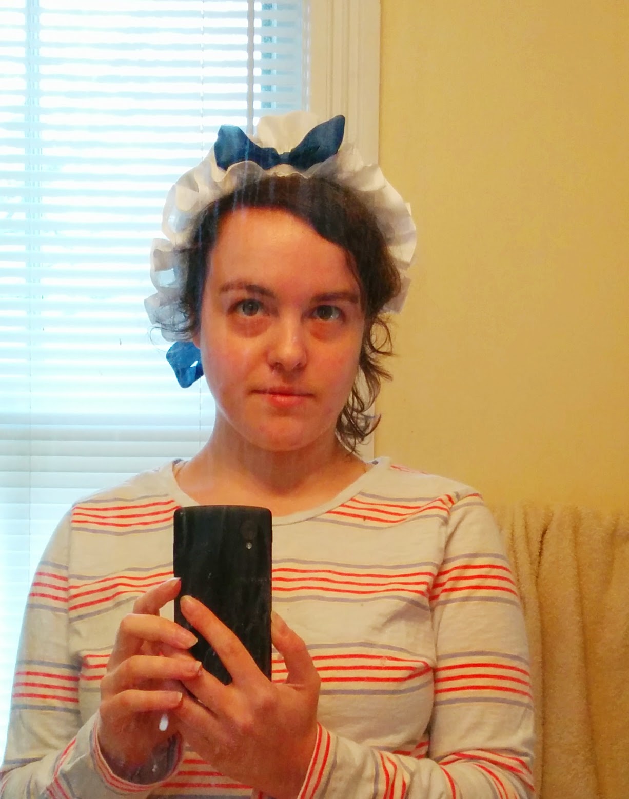 Garsault explained the construction well enough for me, and my cap (minus the ruffles, which I only just put on) was holding very well to my head, but I still needed to figure out the ribbon. I’m not quite sure now why it was so difficult for me, but in the end – to cut a really rambly story short – I realized that in a lot of portraits and fashion plates, especially ones with bouillonnée ribbons, it looks like the middle of the ribbon is tied into a single or double bow over the forehead, it’s sewn down at each bubble, and then the ends tie at the back of the neck, providing another stabilizing element.